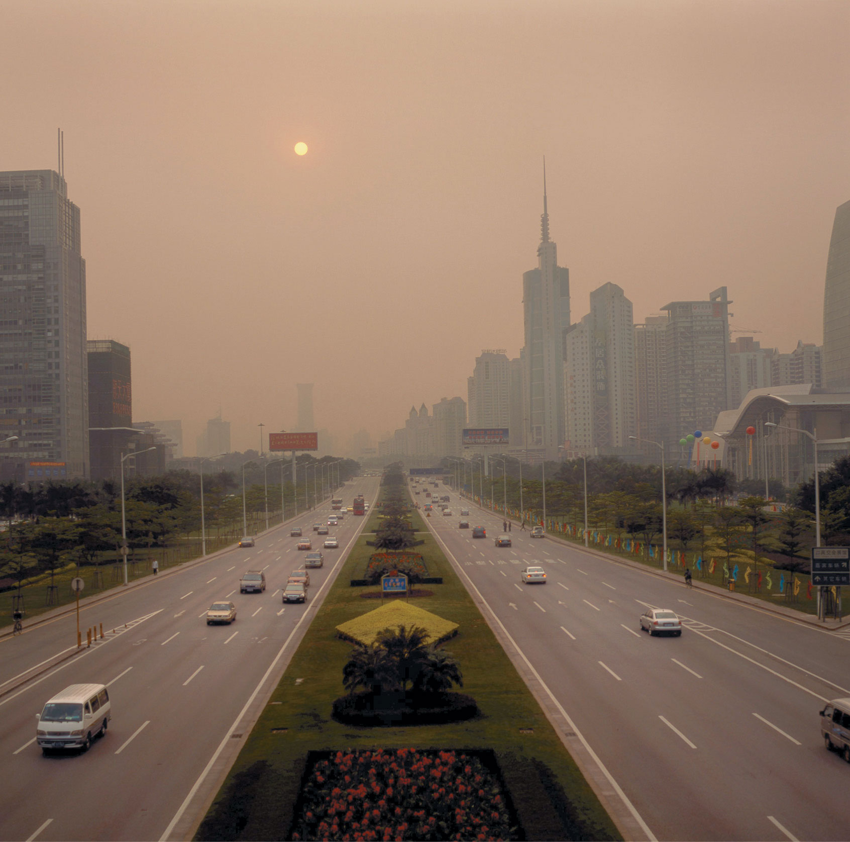 A smoggy sunset in Shenzhen, China. The reaction of O2 with N2 at high temperature in an internal combustion engine produces small amounts of NO, which reacts with atmospheric O2 to form NO2, an important component of smog. The reddish-brown color of NO2 is responsible for the characteristic color of smog, as shown in this true-color photo.