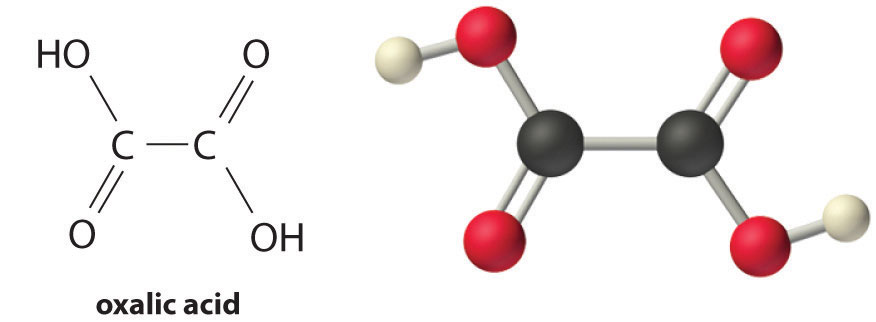 Calculate the pH of a solution prepared by adding 55.0 mL of a 0.120 M NaOH solution to 100.0 mL of a 0.0510 M solution of oxalic acid (HO2CCO2H), a diprotic acid (abbreviated as H2ox). Oxalic acid, the simplest dicarboxylic acid, is found in rhubarb and many other plants. Rhubarb leaves are toxic because they contain the calcium salt of the fully deprotonated form of oxalic acid, the oxalate ion (−O2CCO2−, abbreviated ox2−).Oxalate salts are toxic for two reasons. First, oxalate salts of divalent cations such as Ca2+ are insoluble at neutral pH but soluble at low pH, as we shall see in Chapter 17 "Solubility and Complexation Equilibriums". As a result, calcium oxalate dissolves in the dilute acid of the stomach, allowing oxalate to be absorbed and transported into cells, where it can react with calcium to form tiny calcium oxalate crystals that damage tissues. Second, oxalate forms stable complexes with metal ions, which can alter the distribution of metal ions in biological fluids.