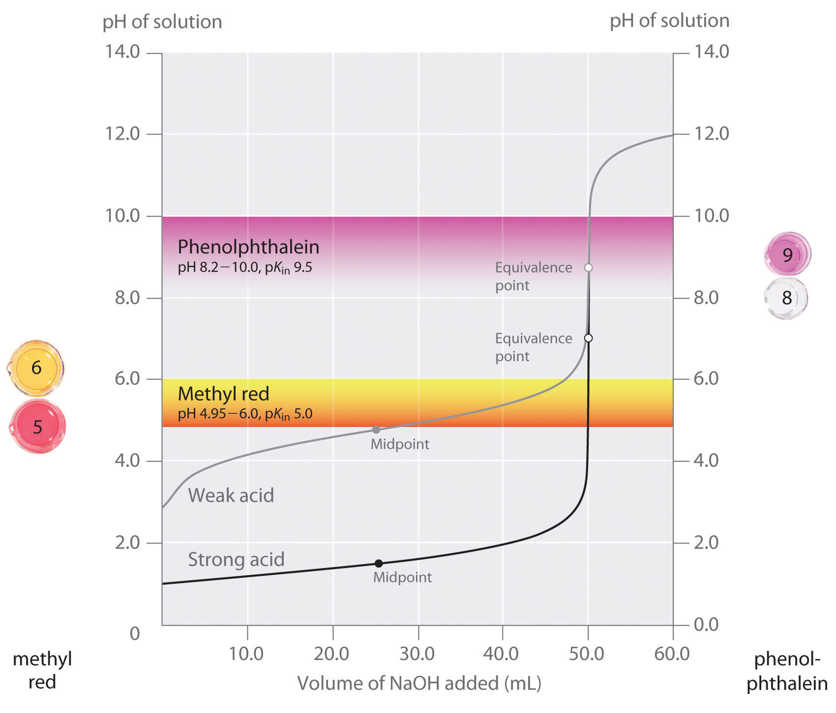 The graph shows the results obtained using two indicators (methyl red and phenolphthalein) for the titration of 0.100 M solutions of a strong acid (HCl) and a weak acid (acetic acid) with 0.100 M NaOH. Due to the steepness of the titration curve of a strong acid around the equivalence point, either indicator will rapidly change color at the equivalence point for the titration of the strong acid. In contrast, the pKin for methyl red (5.0) is very close to the pKa of acetic acid (4.76); the midpoint of the color change for methyl red occurs near the midpoint of the titration, rather than at the equivalence point.