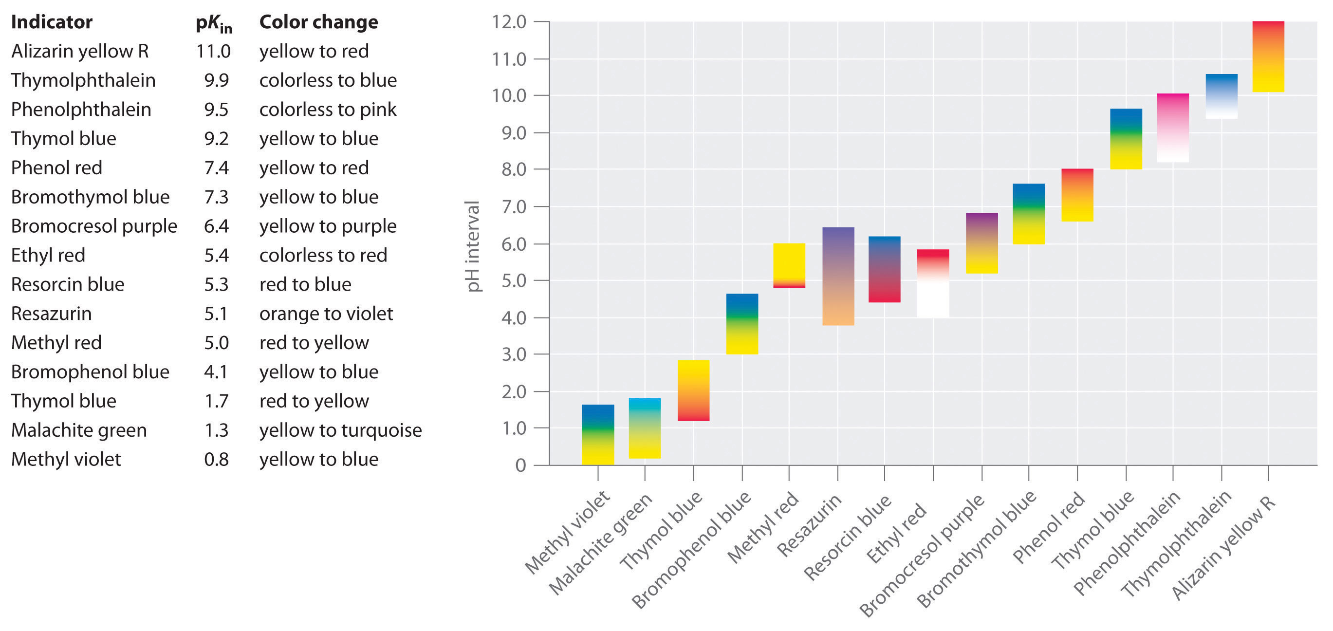 Synthetic indicators have been developed that meet these criteria and cover virtually the entire pH range. Figure 16.23 "Some Common Acid–Base Indicators" shows the approximate pH range over which some common indicators change color and their change in color. In addition, some indicators (such as thymol blue) are polyprotic acids or bases, which change color twice at widely separated pH values.