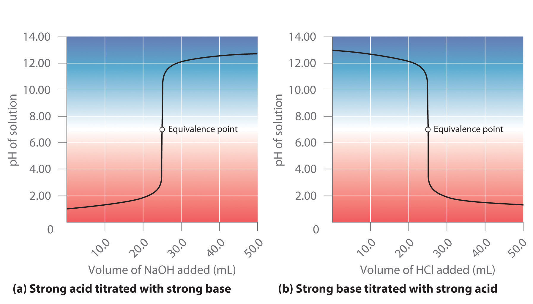 Suppose that we now add 0.20 M NaOH to 50.0 mL of a 0.10 M solution of HCl. Because HCl is a strong acid that is completely ionized in water, the initial [H+] is 0.10 M, and the initial pH is 1.00. Adding NaOH decreases the concentration of H+ because of the neutralization reaction: (in part (a) in Figure 16.18 "The Titration of (a) a Strong Acid with a Strong Base and (b) a Strong Base with a Strong Acid"). Thus the pH of the solution increases gradually. Near the equivalence pointThe point in a titration where a stoichiometric amount of the titrant has been added., however, the point at which the number of moles of base (or acid) added equals the number of moles of acid (or base) originally present in the solution, the pH increases much more rapidly because most of the H+ ions originally present have been consumed. (For more information on titrations and the equivalence point, see Chapter 4 "Reactions in Aqueous Solution", Section 4.9 "Quantitative Analysis Using Titrations".) For the titration of a monoprotic strong acid (HCl) with a monobasic strong base (NaOH), we can calculate the volume of base needed to reach the equivalence point from the following relationship: