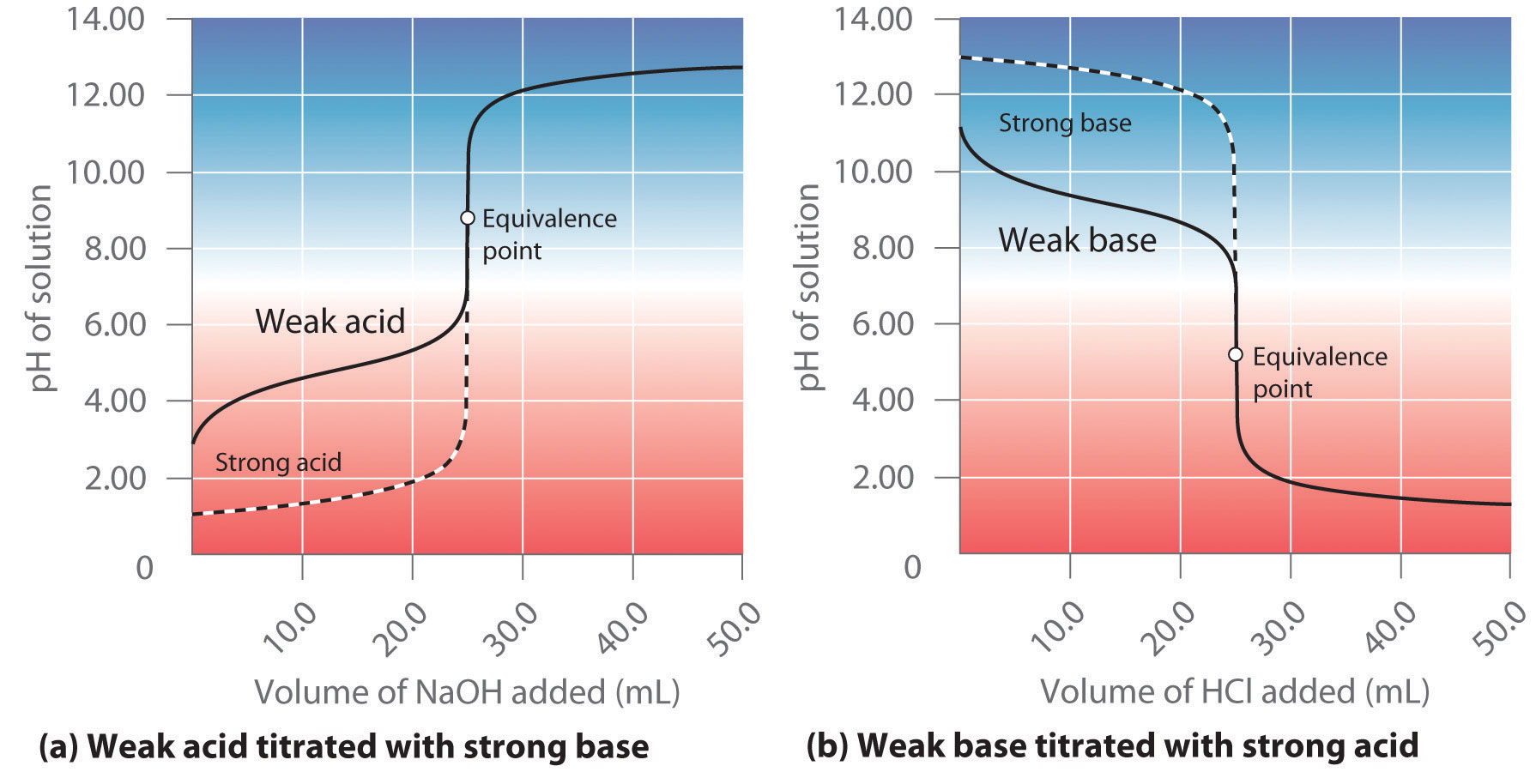 The identity of the weak acid or weak base being titrated strongly affects the shape of the titration curve. Figure 16.20 "Effect of Acid or Base Strength on the Shape of Titration Curves" illustrates the shape of titration curves as a function of the pKa or the pKb. As the acid or the base being titrated becomes weaker (its pKa or pKb becomes larger), the pH change around the equivalence point decreases significantly. With very dilute solutions, the curve becomes so shallow that it can no longer be used to determine the equivalence point.