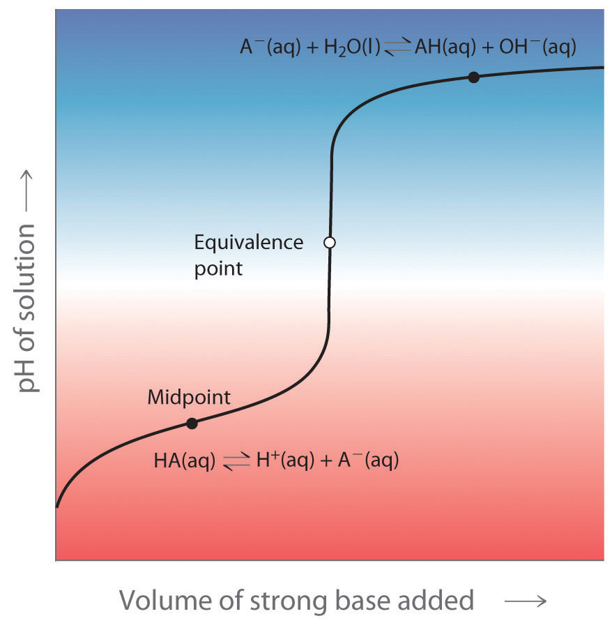 This schematic plot of pH for the titration of a weak acid with a strong base shows the nearly flat region of the titration curve around the midpoint, which corresponds to the formation of a buffer. At the lower left, the pH of the solution is determined by the equilibrium for dissociation of the weak acid; at the upper right, the pH is determined by the equilibrium for reaction of the conjugate base with water.