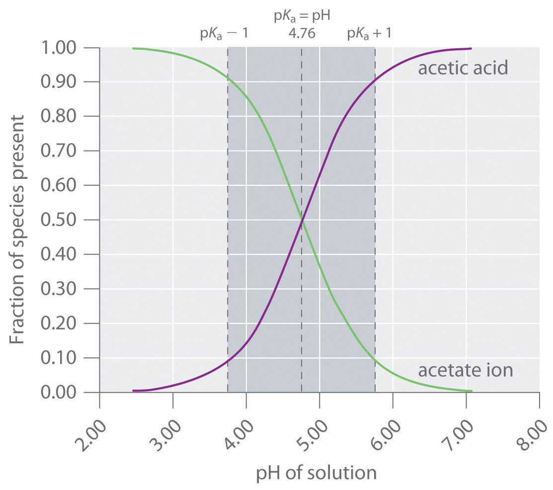 A buffer that contains approximately equal amounts of a weak acid and its conjugate base in solution is equally effective at neutralizing either added base or added acid. This is shown in Figure 16.27 "Distribution Curve Showing the Fraction of Acetic Acid Molecules and Acetate Ions as a Function of pH in a Solution of Acetic Acid" for an acetic acid/sodium acetate buffer. Adding a given amount of strong acid shifts the system along the horizontal axis to the left, whereas adding the same amount of strong base shifts the system the same distance to the right. In either case, the change in the ratio of CH3CO2− to CH3CO2H from 1:1 reduces the buffer capacity of the solution.