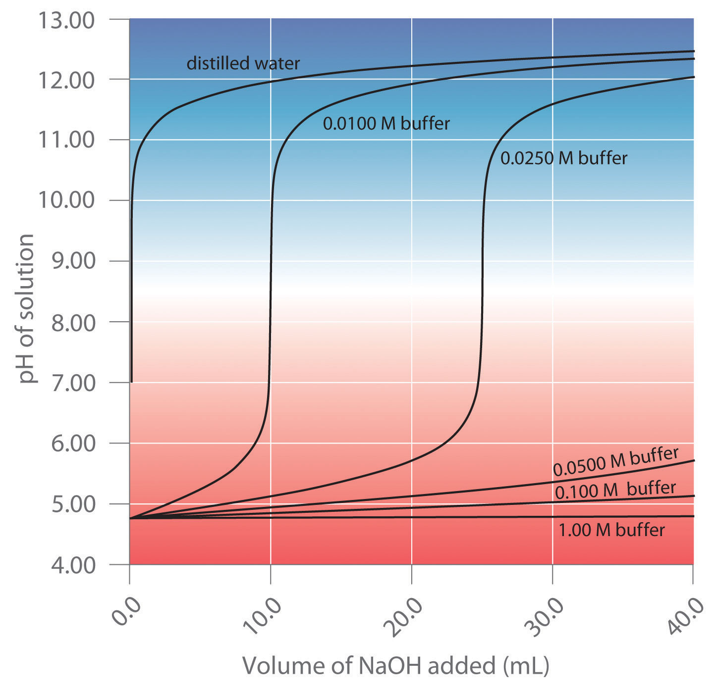 Buffers are characterized by the pH range over which they can maintain a more or less constant pH and by their buffer capacityThe amount of strong acid or strong base that a buffer solution can absorb before the pH changes dramatically., the amount of strong acid or base that can be absorbed before the pH changes significantly. Although the useful pH range of a buffer depends strongly on the chemical properties of the weak acid and weak base used to prepare the buffer (i.e., on K), its buffer capacity depends solely on the concentrations of the species in the buffered solution. The more concentrated the buffer solution, the greater its buffer capacity. As illustrated in Figure 16.26 "Effect of Buffer Concentration on the Capacity of a Buffer", when NaOH is added to solutions that contain different concentrations of an acetic acid/sodium acetate buffer, the observed change in the pH of the buffer is inversely proportional to the concentration of the buffer. If the buffer capacity is 10 times larger, then the buffer solution can absorb 10 times more strong acid or base before undergoing a significant change in pH.