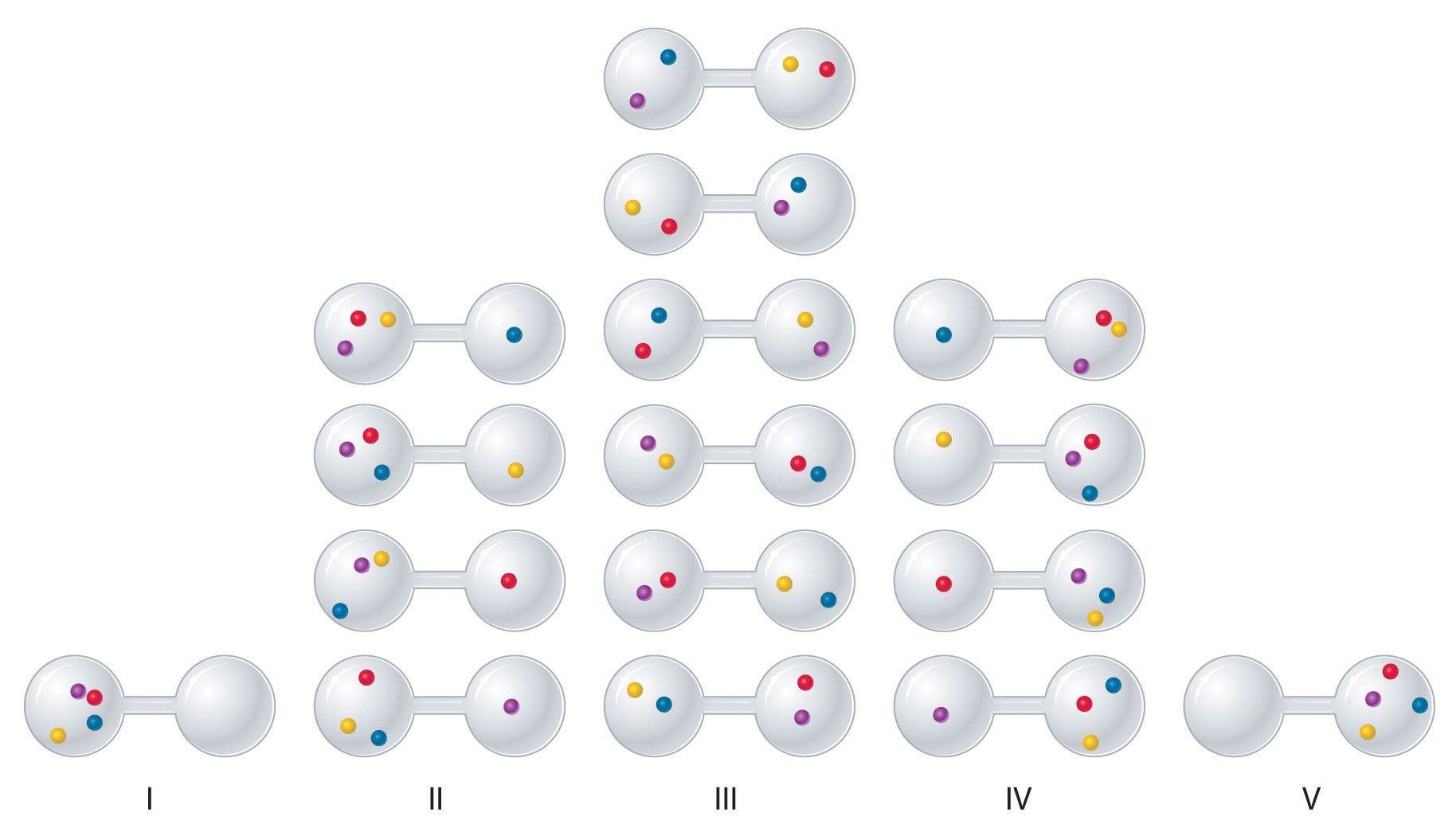 We can see how to calculate these kinds of probabilities for a chemical system by considering the possible arrangements of a sample of four gas molecules in a two-bulb container (Figure 18.8 "The Possible Microstates for a Sample of Four Gas Molecules in Two Bulbs of Equal Volume"). There are five possible arrangements: all four molecules in the left bulb (I); three molecules in the left bulb and one in the right bulb (II); two molecules in each bulb (III); one molecule in the left bulb and three molecules in the right bulb (IV); and four molecules in the right bulb (V). If we assign a different color to each molecule to keep track of it for this discussion (remember, however, that in reality the molecules are indistinguishable from one another), we can see that there are 16 different ways the four molecules can be distributed in the bulbs, each corresponding to a particular microstate. As shown in Figure 18.8 "The Possible Microstates for a Sample of Four Gas Molecules in Two Bulbs of Equal Volume", arrangement I is associated with a single microstate, as is arrangement V, so each arrangement has a probability of 1/16. Arrangements II and IV each have a probability of 4/16 because each can exist in four microstates. Similarly, six different microstates can occur as arrangement III, making the probability of this arrangement 6/16. Thus the arrangement that we would expect to encounter, with half the gas molecules in each bulb, is the most probable arrangement. The others are not impossible but simply less likely.