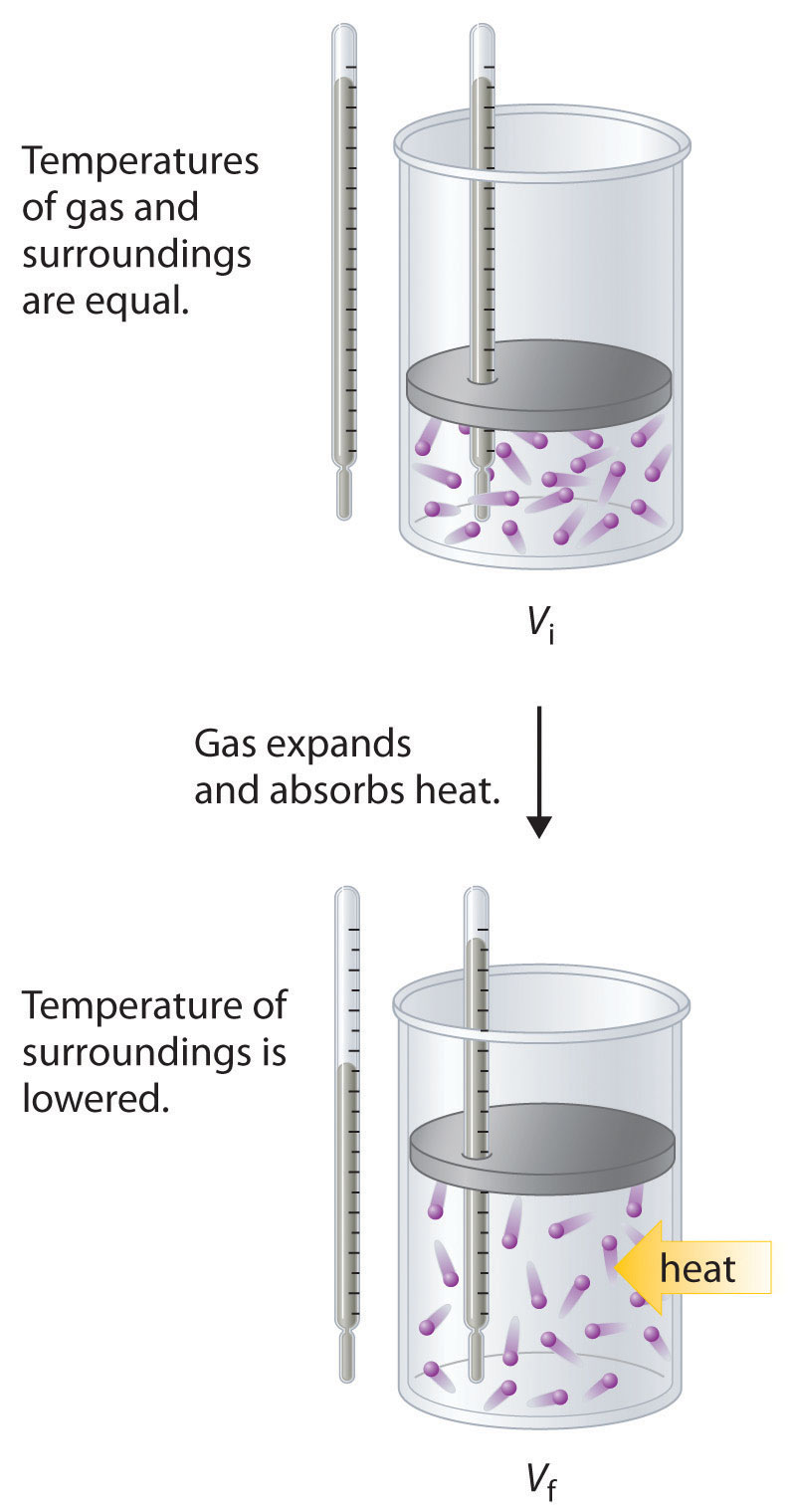 In the initial state (top), the temperatures of a gas and the surroundings are the same. During the reversible expansion of the gas, heat must be added to the gas to maintain a constant temperature. Thus the internal energy of the gas does not change, but work is performed on the surroundings. In the final state (bottom), the temperature of the surroundings is lower because the gas has absorbed heat from the surroundings during expansion.