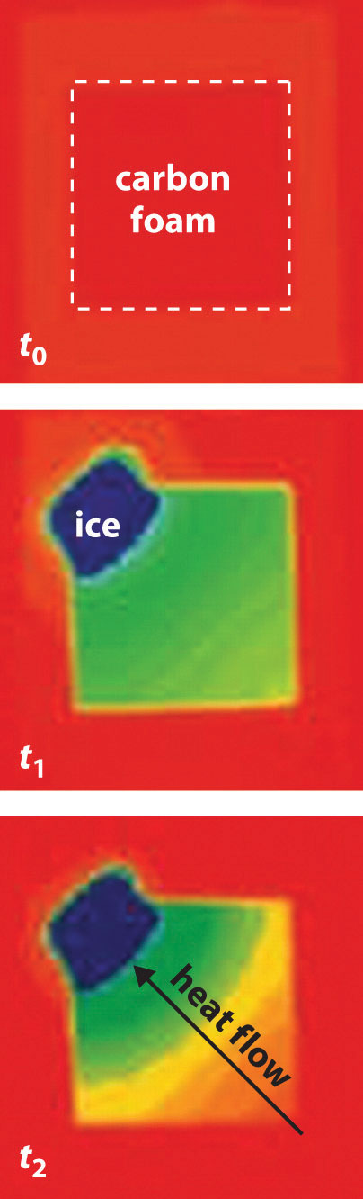 By convention, a thermogram shows cold regions in blue, warm regions in red, and thermally intermediate regions in green. When an ice cube (the system, dark blue) is placed on the corner of a square sample of low-density carbon foam with very high thermal conductivity, the temperature of the foam is lowered (going from red to green). As the ice melts, a temperature gradient appears, ranging from warm to very cold. An arrow indicates the direction of heat flow from the surroundings (red and green) to the ice cube. The amount of heat lost by the surroundings is the same as the amount gained by the ice, so the entropy of the universe does not change.