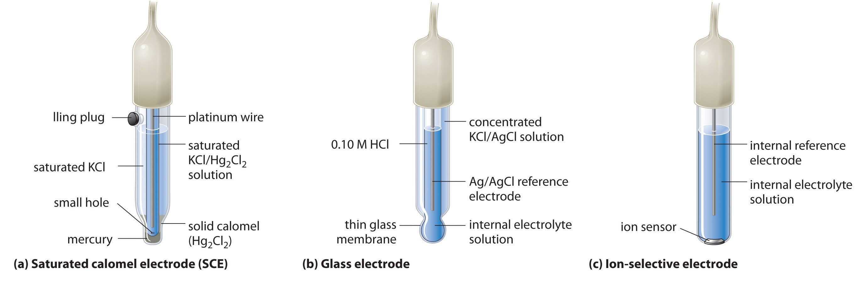 (a) The SCE is a reference electrode that consists of a platinum wire inserted into a moist paste of liquid mercury (calomel; Hg2Cl2) and KCl. The interior cell is surrounded by an aqueous KCl solution, which acts as a salt bridge between the interior cell and the exterior solution. (b) In a glass electrode, an internal Ag/AgCl electrode is immersed in a 1 M HCl solution that is separated from the sample solution by a very thin glass membrane. The potential of the electrode depends on the H+ ion concentration of the sample. (c) The potential of an ion-selective electrode depends on the concentration of only a single ionic species in solution.