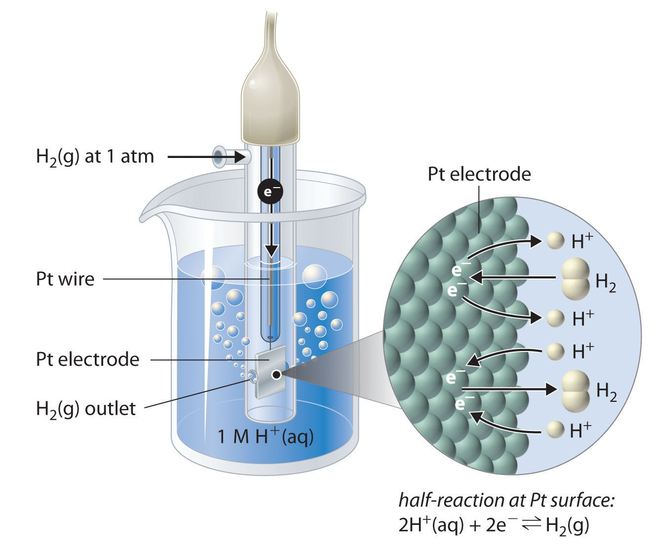 Although it is impossible to measure the potential of any electrode directly, we can choose a reference electrode whose potential is defined as 0 V under standard conditions. The standard hydrogen electrode (SHE)The electrode chosen as the reference for all other electrodes, which has been assigned a standard potential of 0 V and consists of a Pt wire in contact with an aqueous solution that contains 1 M in equilibrium with gas at a pressure of 1 atm at the Pt-solution interface. is universally used for this purpose and is assigned a standard potential of 0 V. It consists of a strip of platinum wire in contact with an aqueous solution containing 1 M H+. The [H+] in solution is in equilibrium with H2 gas at a pressure of 1 atm at the Pt-solution interface (Figure 19.6 "The Standard Hydrogen Electrode"). Protons are reduced or hydrogen molecules are oxidized at the Pt surface according to the following equation: