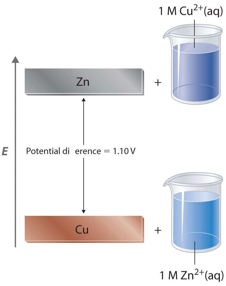The potential energy of a system consisting of metallic Zn and aqueous Cu2+ ions is greater than the potential energy of a system consisting of metallic Cu and aqueous Zn2+ ions. Much of this potential energy difference is because the valence electrons of metallic Zn are higher in energy than the valence electrons of metallic Cu. Because the Zn(s) + Cu2+(aq) system is higher in energy by 1.10 V than the Cu(s) + Zn2+(aq) system, energy is released when electrons are transferred from Zn to Cu2+ to form Cu and Zn2+.