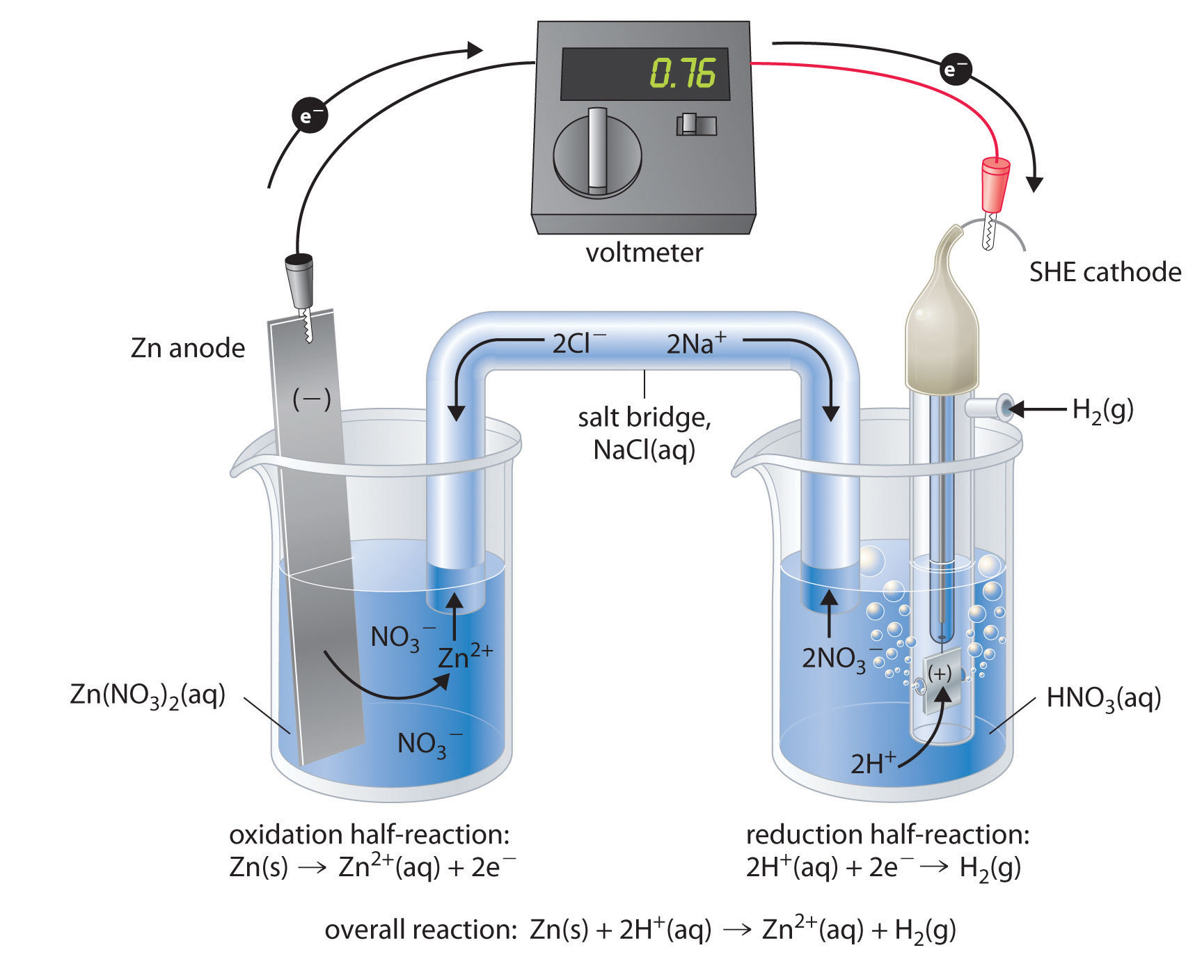 Figure 19.7 "Determining a Standard Electrode Potential Using a Standard Hydrogen Electrode" shows a galvanic cell that consists of a SHE in one beaker and a Zn strip in another beaker containing a solution of Zn2+ ions. When the circuit is closed, the voltmeter indicates a potential of 0.76 V. The zinc electrode begins to dissolve to form Zn2+, and H+ ions are reduced to H2 in the other compartment. Thus the hydrogen electrode is the cathode, and the zinc electrode is the anode. The diagram for this galvanic cell is as follows: