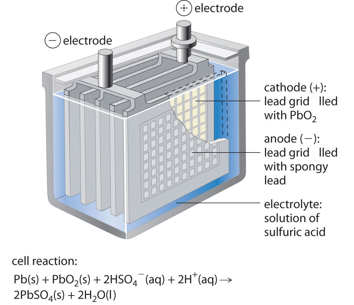 The lead–acid batteryA battery consisting of a plate or grid of spongy lead metal, a cathode containing powdered and an electrolyte that is usually an aqueous solution of is used to provide the starting power in virtually every automobile and marine engine on the market. Marine and car batteries typically consist of multiple cells connected in series. The total voltage generated by the battery is the potential per cell (E°cell) times the number of cells. As shown in Figure 19.15 "One Cell of a Lead–Acid Battery", the anode of each cell in a lead storage battery is a plate or grid of spongy lead metal, and the cathode is a similar grid containing powdered lead dioxide (PbO2). The electrolyte is usually an approximately 37% solution (by mass) of sulfuric acid in water, with a density of 1.28 g/mL (about 4.5 M H2SO4). Because the redox active species are solids, there is no need to separate the electrodes. The electrode reactions in each cell during discharge are as follows: