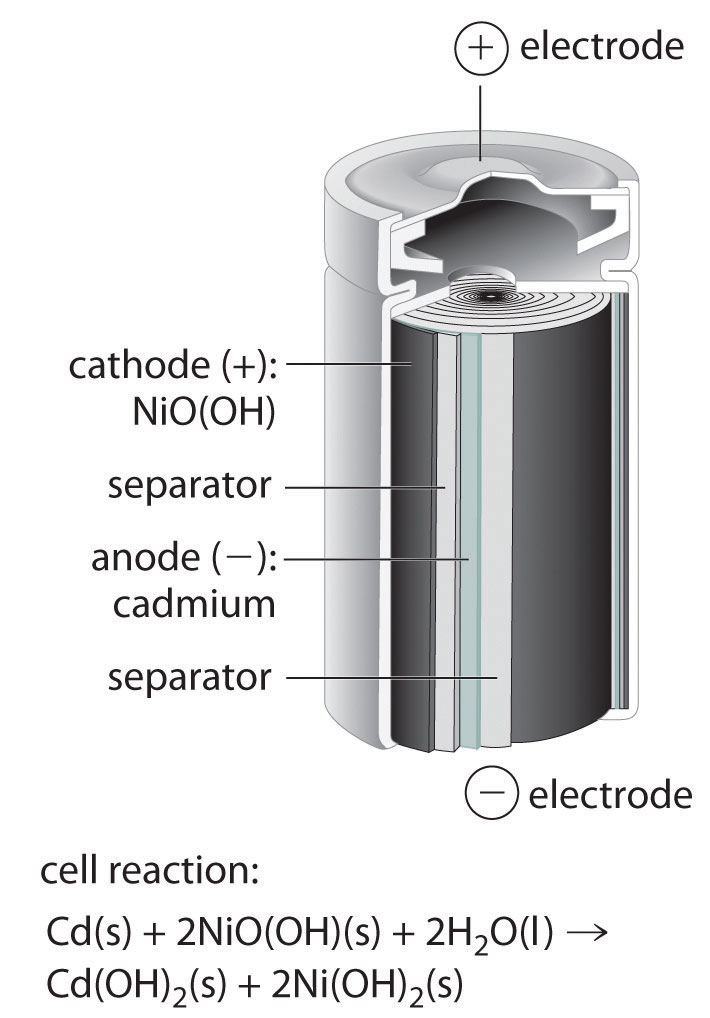 The nickel–cadmiumA type of battery that consists of a water-based cell with a cadmium anode and a highly oxidized nickel cathode., or NiCad, battery is used in small electrical appliances and devices like drills, portable vacuum cleaners, and AM/FM digital tuners. It is a water-based cell with a cadmium anode and a highly oxidized nickel cathode that is usually described as the nickel(III) oxo-hydroxide, NiO(OH). As shown in Figure 19.14 "The Nickel–Cadmium (NiCad) Battery, a Rechargeable Battery", the design maximizes the surface area of the electrodes and minimizes the distance between them, which decreases internal resistance and makes a rather high discharge current possible.