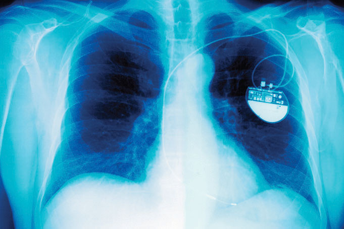 Cardiac pacemaker. An x-ray of a patient showing the location and size of a pacemaker powered by a lithium–iodine battery.