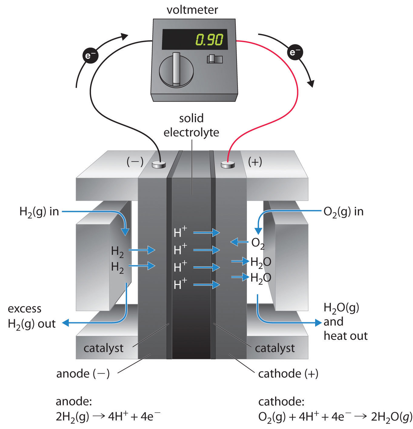 These space vehicles use a hydrogen/oxygen fuel cell that requires a continuous input of H2(g) and O2(g), as illustrated in Figure 19.16 "A Hydrogen Fuel Cell Produces Electrical Energy Directly from a Chemical Reaction". The electrode reactions are as follows: