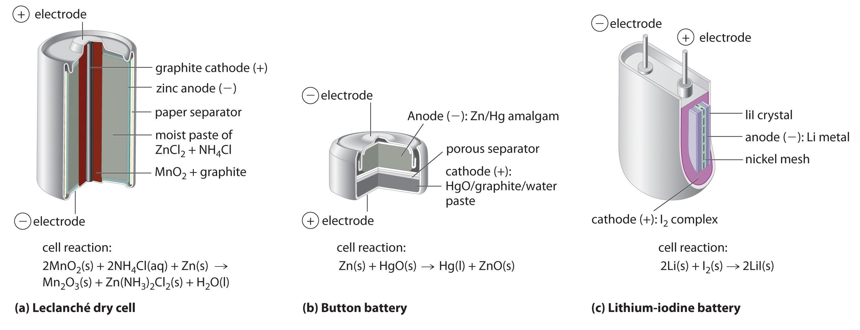 (a) A Leclanché dry cell is actually a “wet cell,” in which the electrolyte is an acidic water-based paste containing MnO2, NH4Cl, ZnCl2, graphite, and starch. Though inexpensive to manufacture, the cell is not very efficient in producing electrical energy and has a limited shelf life. (b) In a button battery, the anode is a zinc–mercury amalgam, and the cathode can be either HgO (shown here) or Ag2O as the oxidant. Button batteries are reliable and have a high output-to-mass ratio, which allows them to be used in applications such as calculators and watches, where their small size is crucial. (c) A lithium–iodine battery consists of two cells separated by a metallic nickel mesh that collects charge from the anodes. The anode is lithium metal, and the cathode is a solid complex of I2. The electrolyte is a layer of solid LiI that allows Li+ ions to diffuse from the cathode to the anode. Although this type of battery produces only a relatively small current, it is highly reliable and long-lived.