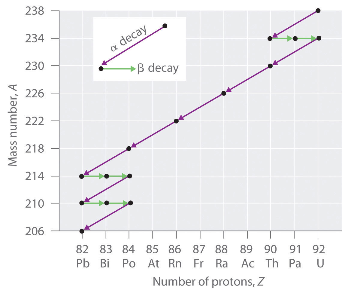 The two general kinds of nuclear reactions are nuclear decay reactions and nuclear transmutation reactions. In a nuclear decay reactionA nuclear reaction that occurs when an unstable nucleus emits radiation and is transformed into the nucleus of one or more other elements., also called radioactive decay, an unstable nucleus emits radiation and is transformed into the nucleus of one or more other elements. The resulting daughter nuclei have a lower mass and are lower in energy (more stable) than the parent nucleus that decayed. In contrast, in a nuclear transmutation reactionA nuclear reaction in which a nucleus reacts with a subatomic particle or another nuleus to give a product nucleus that is more massive than the starting material., a nucleus reacts with a subatomic particle or another nucleus to form a product nucleus that is more massive than the starting material. As we shall see, nuclear decay reactions occur spontaneously under all conditions, but nuclear transmutation reactions occur only under very special conditions, such as the collision of a beam of highly energetic particles with a target nucleus or in the interior of stars. We begin this section by considering the different classes of radioactive nuclei, along with their characteristic nuclear decay reactions and the radiation they emit.