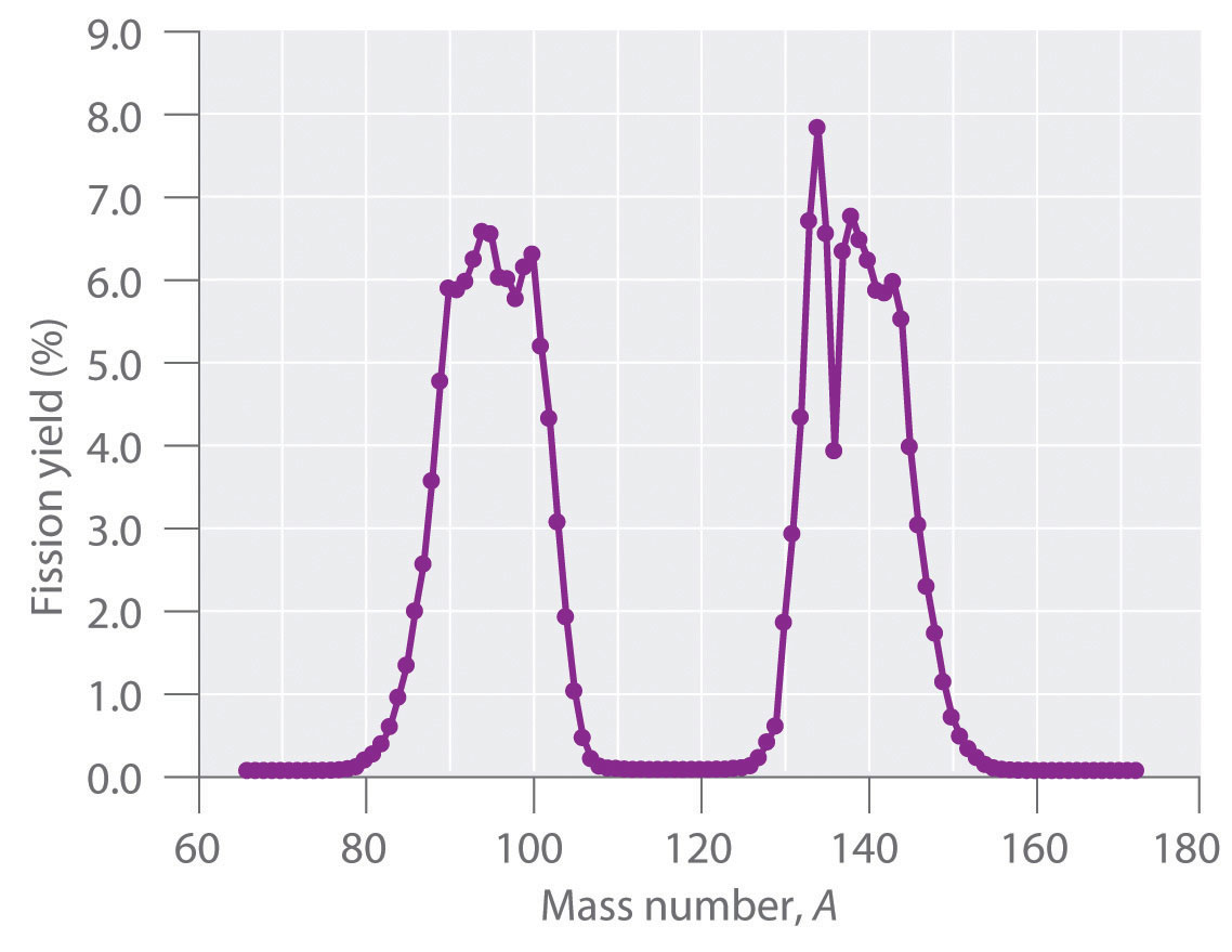 Only very massive nuclei with high neutron-to-proton ratios can undergo spontaneous fissionA nuclear decay reaction in which the nucleus breaks into two pieces with different atomic numbers and atomic masses., in which the nucleus breaks into two pieces that have different atomic numbers and atomic masses. This process is most important for the transactinide elements, with Z ≥ 104. Spontaneous fission is invariably accompanied by the release of large amounts of energy, and it is usually accompanied by the emission of several neutrons as well. An example is the spontaneous fission of C98254f, which gives a distribution of fission products; one possible set of products is shown in the following equation: