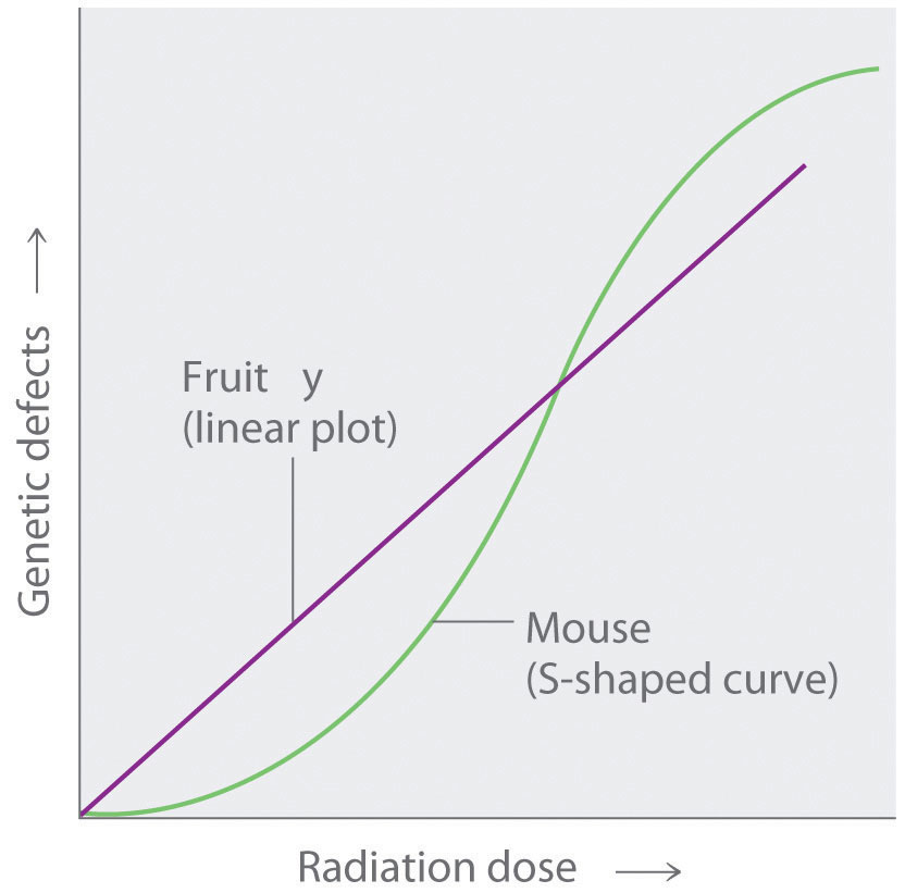 Studies on fruit flies show a linear relationship between the number of genetic defects and the magnitude of the radiation dose and exposure time, which is consistent with a cumulative effect of radiation. In contrast, studies on mice show an S-shaped curve, which suggests that the number of defects is lower when radiation exposure occurs over a longer time. Which of these relationships is more applicable to humans is a matter of considerable debate.