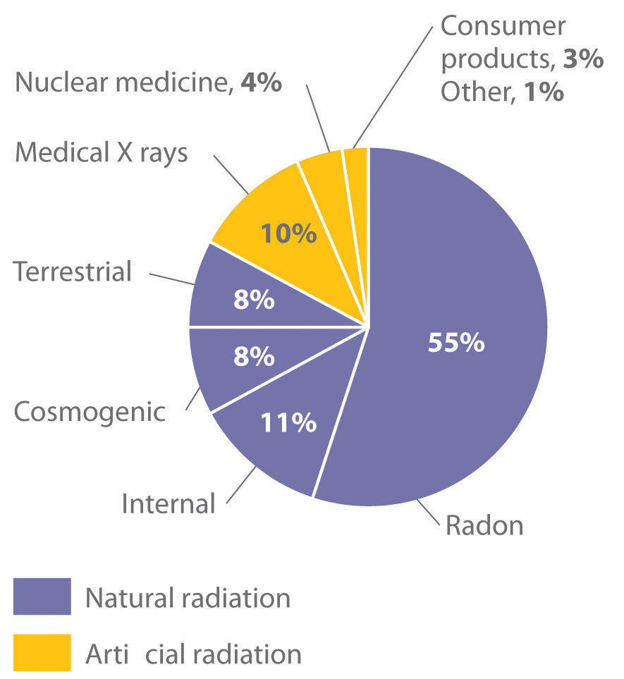 We are continuously exposed to measurable background radiation from a variety of natural sources, which, on average, is equal to about 150–600 mrem/yr (Figure 20.13 "The Radiation Exposure of a Typical Adult in the United States"). One component of background radiation is cosmic rays, high-energy particles and γ rays emitted by the sun and other stars, which bombard Earth continuously. Because cosmic rays are partially absorbed by the atmosphere before they reach Earth’s surface, the exposure of people living at sea level (about 30 mrem/yr) is significantly less than the exposure of people living at higher altitudes (about 50 mrem/yr in Denver, Colorado). Every 4 hours spent in an airplane at greater than 30,000 ft adds about 1 mrem to a person’s annual radiation exposure.