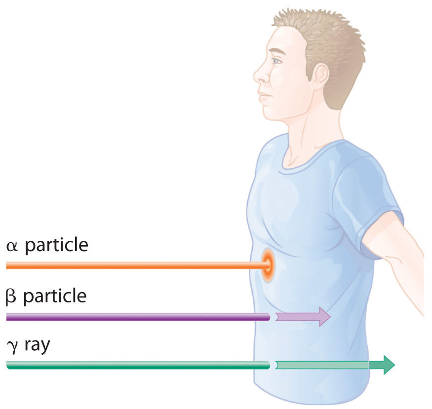 The relative abilities of the various forms of ionizing radiation to penetrate biological tissues are illustrated in Figure 20.12 "Depth of Penetration of Ionizing Radiation". Because of its high charge and mass, α radiation interacts strongly with matter. Consequently, it does not penetrate deeply into an object, and it can be stopped by a piece of paper, clothing, or skin. In contrast, γ rays, with no charge and essentially no mass, do not interact strongly with matter and penetrate deeply into most objects, including the human body. Several inches of lead or more than 12 inches of special concrete are needed to completely stop γ rays. Because β particles are intermediate in mass and charge between α particles and γ rays, their interaction with matter is also intermediate. Beta particles readily penetrate paper or skin, but they can be stopped by a piece of wood or a relatively thin sheet of metal.