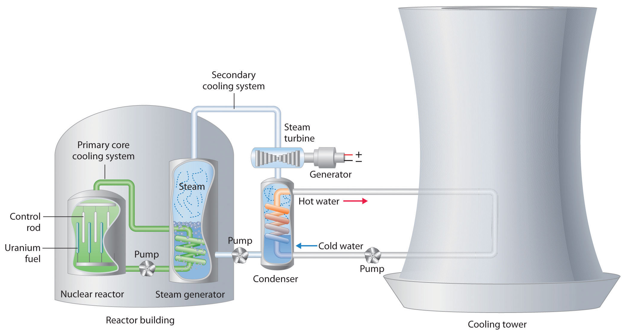 The fuel rods are made of a corrosion-resistant alloy that encases the partially enriched uranium fuel; controlled fission of 235U in the fuel produces heat. Water surrounds the fuel rods and moderates the kinetic energy of the neutrons, slowing them to increase the probability that they will induce fission. Control rods that contain elements such as boron, cadmium, or hafnium, which are very effective at absorbing neutrons, are used to control the rate of the fission reaction. A heat exchanger is used to boil water in a secondary cooling system, creating steam to drive the turbine and produce electricity. The large hyperbolic cooling tower, which is the most visible portion of the facility, condenses the steam in the secondary cooling circuit; it is often located at some distance from the actual reactor.