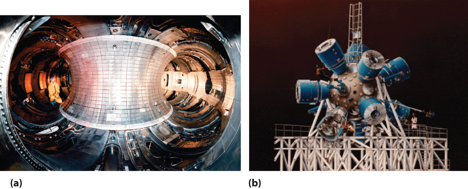 The extraordinarily high temperatures needed to initiate a nuclear fusion reaction would immediately destroy a container made of any known material. (a) One way to avoid contact with the container walls is to use a high-energy plasma as the fuel. Because plasma is essentially a gas composed of ionized particles, it can be confined using a strong magnetic field shaped like a torus (a hollow donut). (b) Another approach to nuclear fusion is inertial confinement, which uses an icosahedral array of powerful lasers to heat and compress a tiny fuel pellet (a mixture of solid LiD and LiT) to induce fusion.