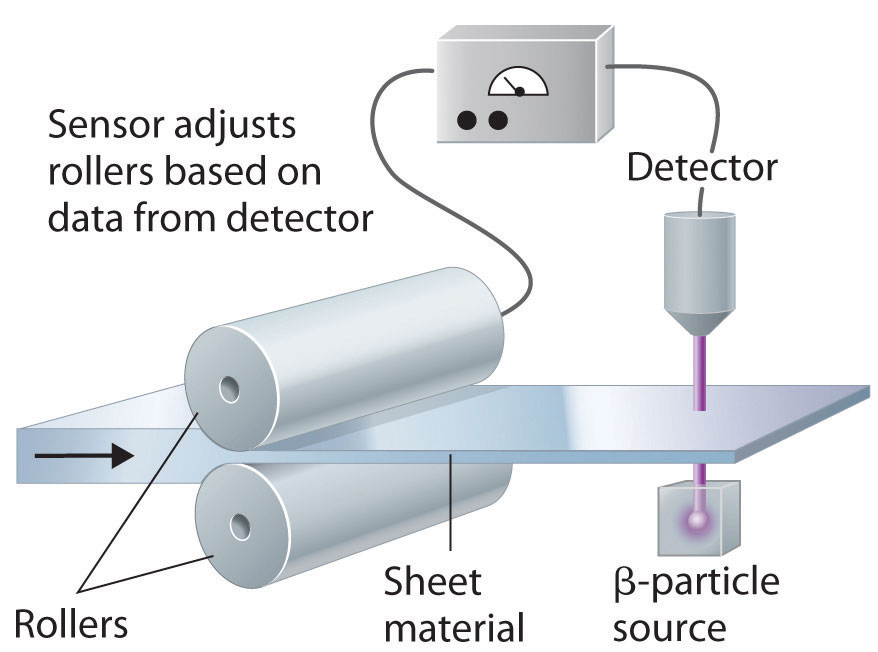 Because the amount of radiation absorbed by a material is proportional to its thickness, radiation can be used to control the thickness of plastic film, tin foil, or paper. As shown, a beta emitter is placed on one side of the material being produced and a detector on the other. An increase in the amount of radiation that reaches the detector indicates a decrease in the thickness of the material and vice versa. The output of the detector can thus be used to control the thickness of the material.