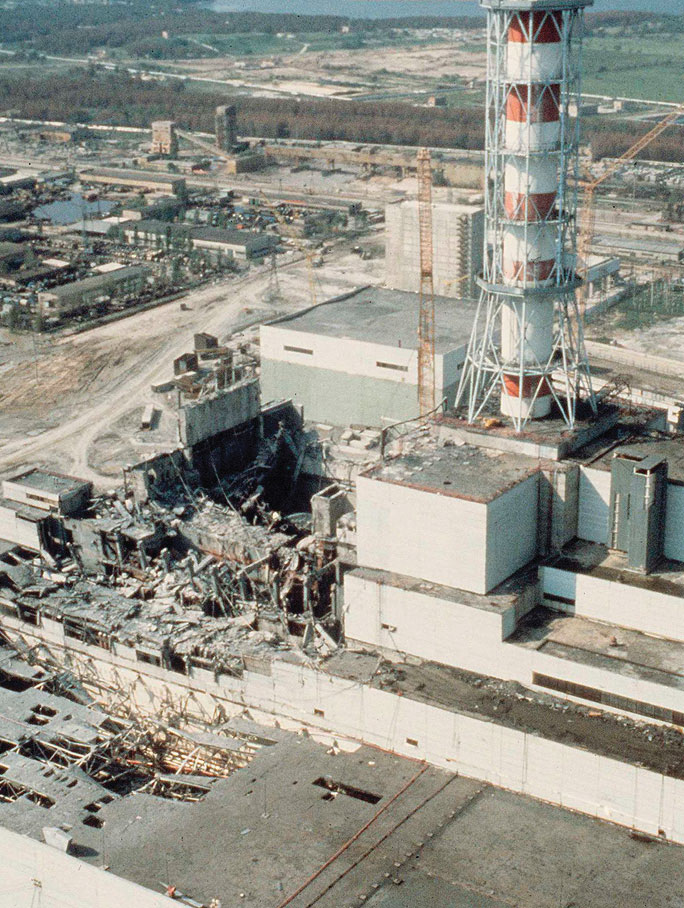 In 1986, mechanical and operational failures during testing at the Chernobyl power plant in the USSR (now in the Ukraine) caused an uncontrolled nuclear chain reaction. The resulting fire destroyed much of the facility and severely damaged the core of the reactor, resulting in the release of large amounts of radiation that was spread over the surrounding area by the prevailing winds. The effects were devastating to the health of the population in the region and to the Soviet economy.