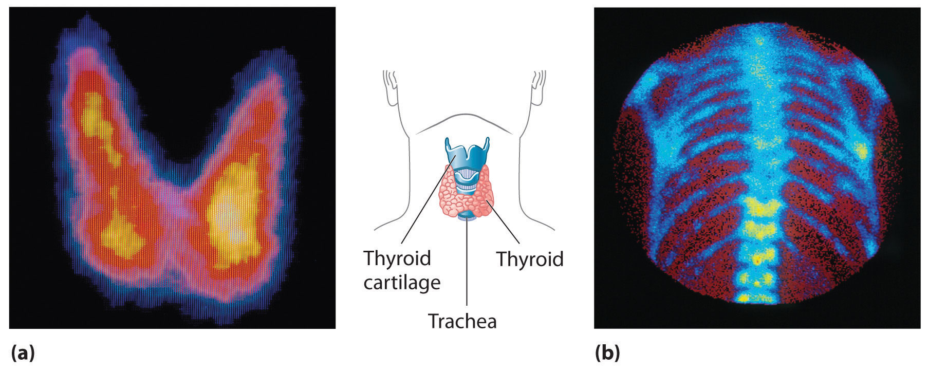 (a) Radioactive iodine is used both to obtain images of the thyroid and to treat thyroid cancer. Injected iodine-123 or iodine-131 is selectively taken up by the thyroid gland, where it is incorporated into the thyroid hormone: thyroxine. Because iodine-131 emits low-energy β particles that are absorbed by the surrounding tissue, it can be used to destroy malignant tissue in the thyroid. In contrast, iodine-123 emits higher-energy γ rays that penetrate tissues readily, enabling it to image the thyroid gland, as shown here. (b) Some technetium compounds are selectively absorbed by cancerous cells within bones. The yellow spots show that a primary cancer has metastasized (spread) to the patient’s spine (lower center) and ribs (right center).