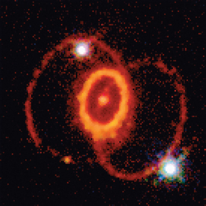 A view of the remains of Supernova 1987A, located in the Large Magellanic Cloud, showing the circular halo of expanding debris produced by the explosion. Multiple neutron-capture events occur during a supernova explosion, forming both the heaviest elements and many of the less stable nuclides.
