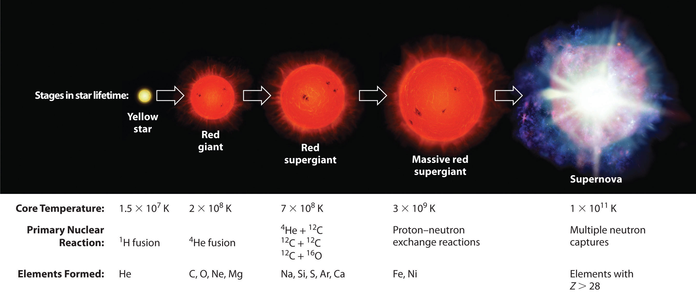 Elements are synthesized in discrete stages during the lifetime of a star, and some steps occur only in the most massive stars known (Figure 20.27 "Nuclear Reactions during the Life Cycle of a Massive Star"). Initially, all stars are formed by the aggregation of interstellar “dust,” which is mostly hydrogen. As the cloud of dust slowly contracts due to gravitational attraction, its density eventually reaches about 100 g/cm3, and the temperature increases to about 1.5 × 107 K, forming a dense plasma of ionized hydrogen nuclei. At this point, self-sustaining nuclear reactions begin, and the star “ignites,” creating a yellow star like our sun.