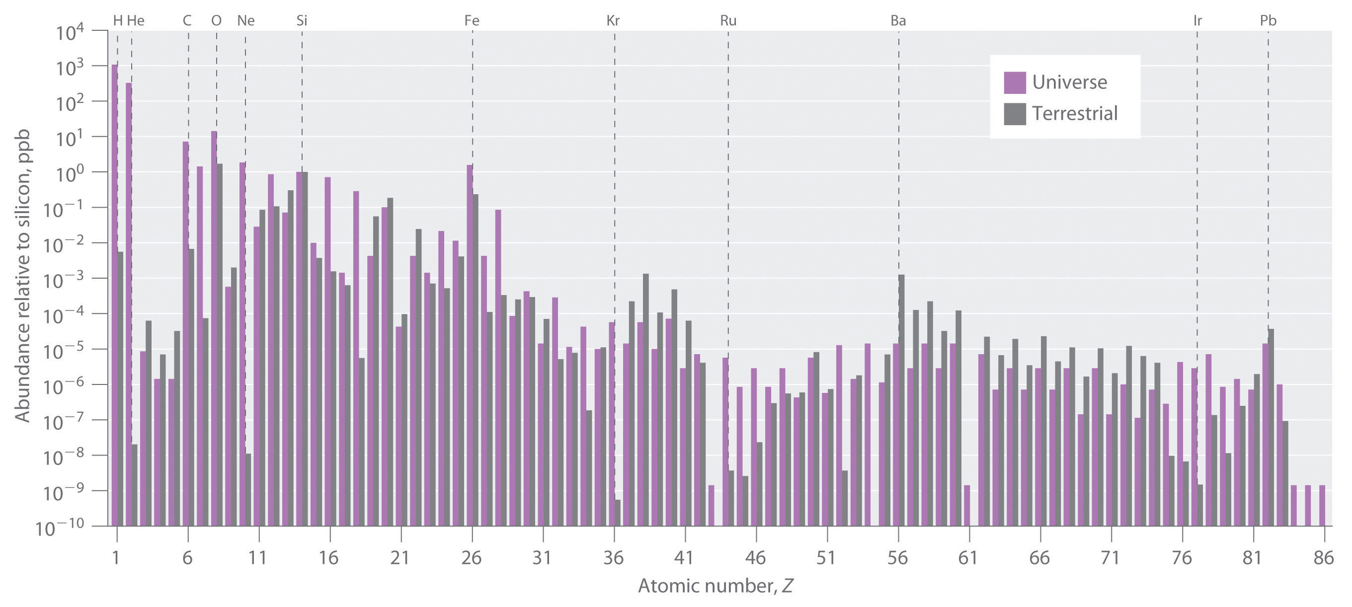 In this logarithmic plot, the relative abundances of the elements relative to that of silicon (arbitrarily set equal to 1) in the universe (green bars) and on Earth (purple bars) are shown as a function of atomic number. Elements with even atomic numbers are generally more abundant in the universe than elements with odd atomic numbers. Also, the relative abundances of many elements in the universe are very different from their relative abundances on Earth.