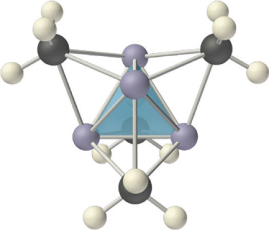 Compounds that contain a metal covalently bonded to a carbon atom of an organic species are called organometallic compoundsA compound that contains a metal covalently bonded to a carbon atom of an organic species.. The properties and reactivities of organometallic compounds differ greatly from those of either the metallic or organic components. Because of its small size, lithium, for example, forms an extensive series of covalent organolithium compounds, such as methyllithium (LiCH3), which are by far the most stable and best-known group 1 organometallic compounds. These volatile, low-melting-point solids or liquids can be sublimed or distilled at relatively low temperatures and are soluble in nonpolar solvents. Like organic compounds, the molten solids do not conduct electricity to any significant degree. Organolithium compounds have a tendency to form oligomers with the formula (RLi)n, where R represents the organic component. For example, in both the solid state and solution, methyllithium exists as a tetramer with the structure shown in Figure 21.12 "The Tetrameric Structure of Methyllithium", where each triangular face of the Li4 tetrahedron is bridged by the carbon atom of a methyl group. Effectively, the carbon atom of each CH3 group is using a single pair of electrons in an sp3 hybrid lobe to bridge three lithium atoms, making this an example of two-electron, four-center bonding. Clearly, such a structure, in which each carbon atom is apparently bonded to six other atoms, cannot be explained using any of the electron-pair bonding schemes discussed in Chapter 8 "Ionic versus Covalent Bonding" and Chapter 9 "Molecular Geometry and Covalent Bonding Models". Molecular orbital theory can explain the bonding in methyllithium, but the description is beyond the scope of this text.
