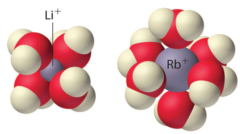 The tetrahedral [Li(H2O)4]+and octahedral [Rb(H2O)6]+complexes. The Li+ ion is so small that it can accommodate only four water molecules around it, but the larger alkali metal cations tend to bind six water molecules.