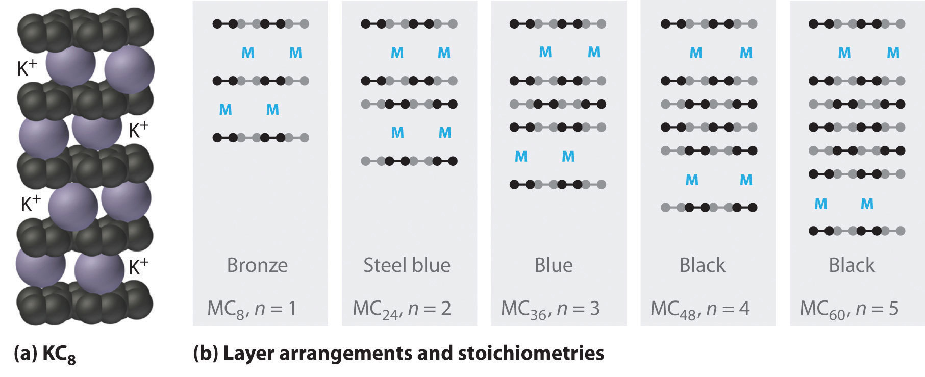 Reacting graphite with alkali metals such as K, Rb, and Cs results in partial reduction of the graphite and insertion of layers of alkali metal cations between sets of n layers of carbon atoms. (a) In KC8, layers of K+ ions are inserted between every pair of carbon layers, giving n = 1. (b) The stoichiometry and color of intercalation compounds depend on the number of layers of carbon atoms (n) between each layer of intercalated metal atoms. This schematic diagram illustrates the most common structures that have been observed.
