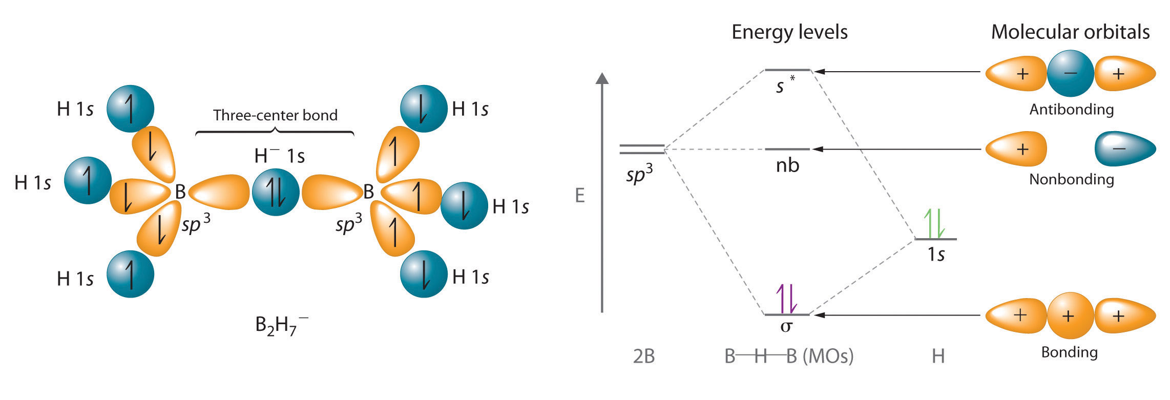 In the B–H–B unit shown, a hydride, with a filled 1s orbital, interacts simultaneously with empty sp3 hybrids on the boron atoms of two BH3 units to give three molecular orbitals. The two bonding electrons occupy the lowest-energy (σ) bonding orbital, thereby holding all three atoms together.