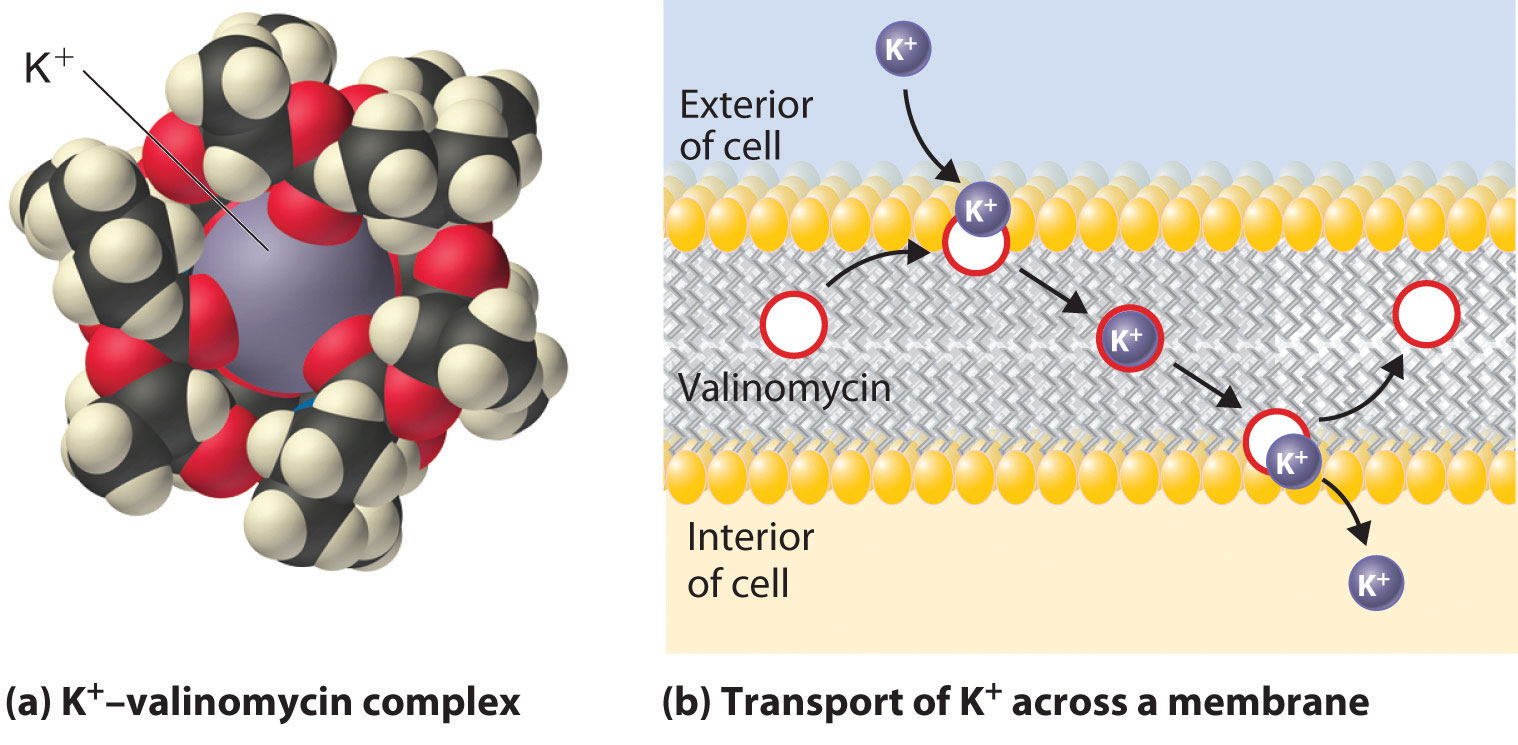 (a) This model of the structure of the K+–valinomycin complex, determined by x-ray diffraction, shows how the valinomycin molecule wraps itself around the K+ ion, shielding it from the environment, in a manner reminiscent of a crown ether complex. (For more information on the crown ethers, see Chapter 13 "Solutions", Section 13.2 "Solubility and Molecular Structure".) (b) Valinomycin kills bacteria by facilitating the transport of K+ ions across the cell membrane, thereby disrupting the normal distribution of ions in the bacterium. At the surface of the membrane, valinomycin binds a K+ ion. Because the hydrophobic exterior of the valinomycin molecule forms a “doughnut” that shields the positive charge of the metal ion, the K+–valinomycin complex is highly soluble in the nonpolar interior of the membrane. After the K+–valinomycin complex diffuses across the membrane to the interior of the cell, the K+ ion is released, and the valinomycin is free to diffuse back to the other side of the membrane to bind another K+ ion. Valinomycin thereby destroys the normal K+ gradient across the membrane, killing the cell.