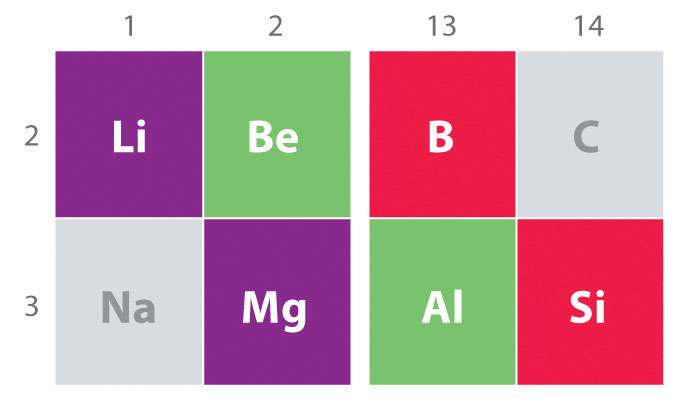 The properties of the lightest element in a group are often more similar to those of the element below and to the right in the periodic table. For instance, the chemistry of lithium is more similar to that of magnesium in group 2 than it is to the chemistry of sodium, the next member in group 1.