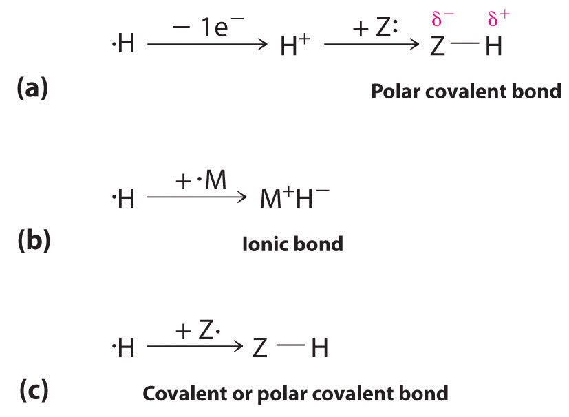 Because of its 1s1 electron configuration and the fact that the 1s orbital can accommodate no more than two electrons, hydrogen can (a) bond to other elements by losing an electron to form a proton, which can accept a pair of electrons from a more electronegative atom to form a polar covalent bond; (b) gain an electron from an electropositive metal to form a hydride ion, resulting in an ionic hydride; or (c) share its half-filled 1s orbital with a half-filled orbital on another atom to form a covalent or a polar covalent electron-pair bond.