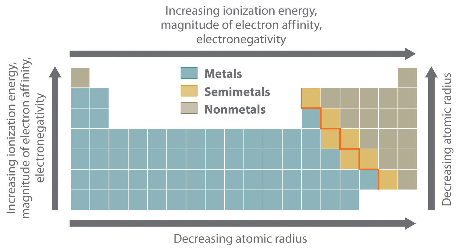 Ionization energies, the magnitude of electron affinities, and electronegativities generally increase from left to right and from bottom to top. In contrast, atomic size decreases from left to right and from bottom to top. Consequently, the elements in the upper right of the periodic table are the smallest and most electronegative; the elements in the bottom left are the largest and least electronegative. The semimetals lie along the diagonal line separating the metals from the nonmetals and exhibit intermediate properties.