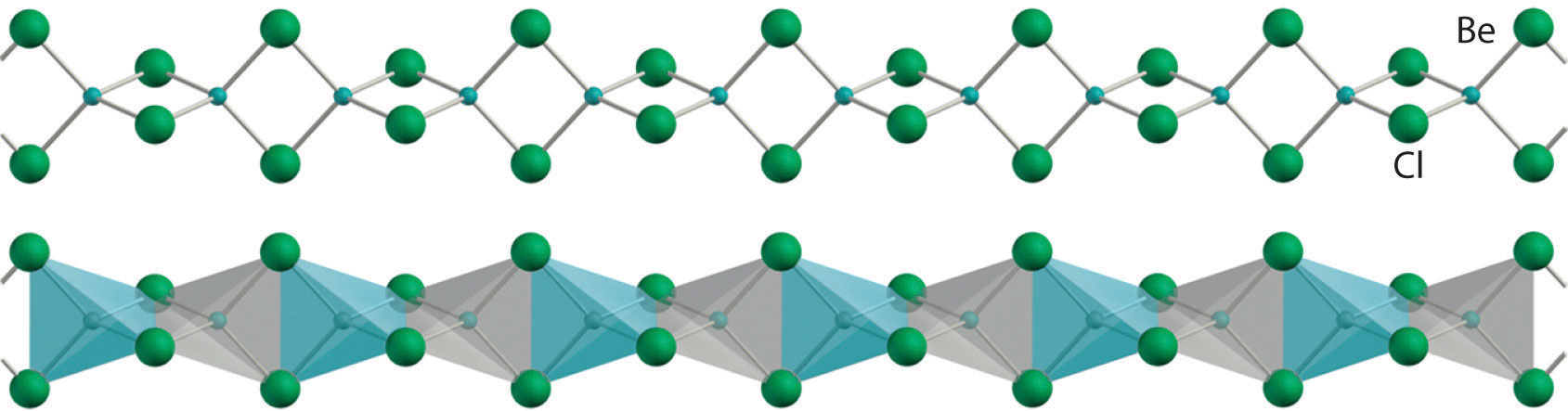 Another important trend to note in main group chemistry is the chemical similarity between the lightest element of one group and the element immediately below and to the right of it in the next group, a phenomenon known as the diagonal effect (Figure 21.2 "The Diagonal Effect") There are, for example, significant similarities between the chemistry of Li and Mg, Be and Al, and B and Si. Both BeCl2 and AlCl3 have substantial covalent character, so they are somewhat soluble in nonpolar organic solvents. In contrast, although Mg and Be are in the same group, MgCl2 behaves like a typical ionic halide due to the lower electronegativity and larger size of magnesium.