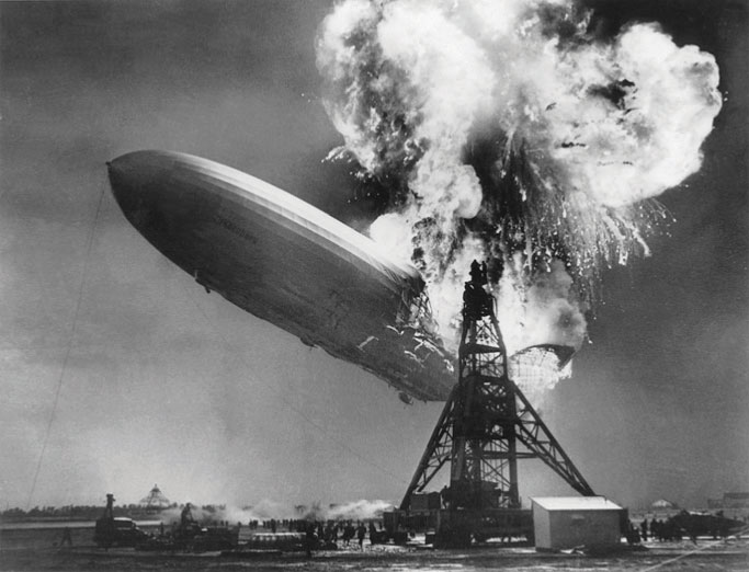 When mixed with air and ignited by a spark, hydrogen gas can explode. The photograph shows the German dirigible Hindenburg on fire at Lakehurst, New Jersey, in 1937, after its hydrogen compartment was accidentally ignited as a consequence of an electrical discharge that caused the dirigible’s flammable skin to catch fire.