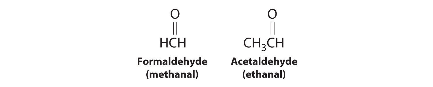 As you learned in Chapter 2 "Molecules, Ions, and Chemical Formulas", Section 2.4 "Naming Covalent Compounds", the systematic nomenclature of organic compounds indicates the positions of substituents using the lowest numbers possible to identify their locations in the carbon chain of the parent compound. If two compounds have the same systematic name, then they are the same compound. Although systematic names are preferred because they are unambiguous, many organic compounds are known by their common names rather than their systematic names. Common nomenclature uses the prefix form—for a compound that contains no carbons other than those in the functional group, and acet—for those that have one carbon atom in addition [two in the case of acetone, (CH3)2C=O]. Thus methanal and ethanal, respectively, are the systematic names for formaldehyde and acetaldehyde.
