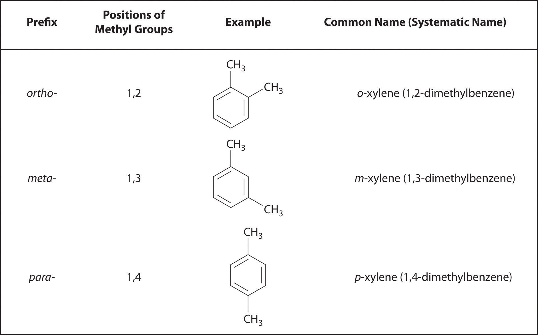 Recall that in the systematic nomenclature of aromatic compounds, the positions of groups attached to the aromatic ring are indicated by numbers, starting with 1 and proceeding around the ring in the direction that produces the lowest possible numbers. For example, the position of the first CH3 group in dimethyl benzene is indicated with a 1, but the second CH3 group, which can be placed in any one of three positions, produces 1,2-dimethylbenzene, 1,3-dimethylbenzene, or 1,4-dimethylbenzene (Figure 24.2 "Common Nomenclature for Aromatic Ring Substitutions"). In common nomenclature, in contrast, the prefixes ortho-, meta-, and para- are used to describe the relative positions of groups attached to an aromatic ring. If the CH3 groups in dimethylbenzene, whose common name is xylene, are adjacent to each other, the compound is commonly called ortho-xylene, abbreviated o-xylene. If they are across from each other on the ring, the compound is commonly called para-xylene or p-xylene. When the arrangement is intermediate between those of ortho- and para- compounds, the name is meta-xylene or m-xylene.