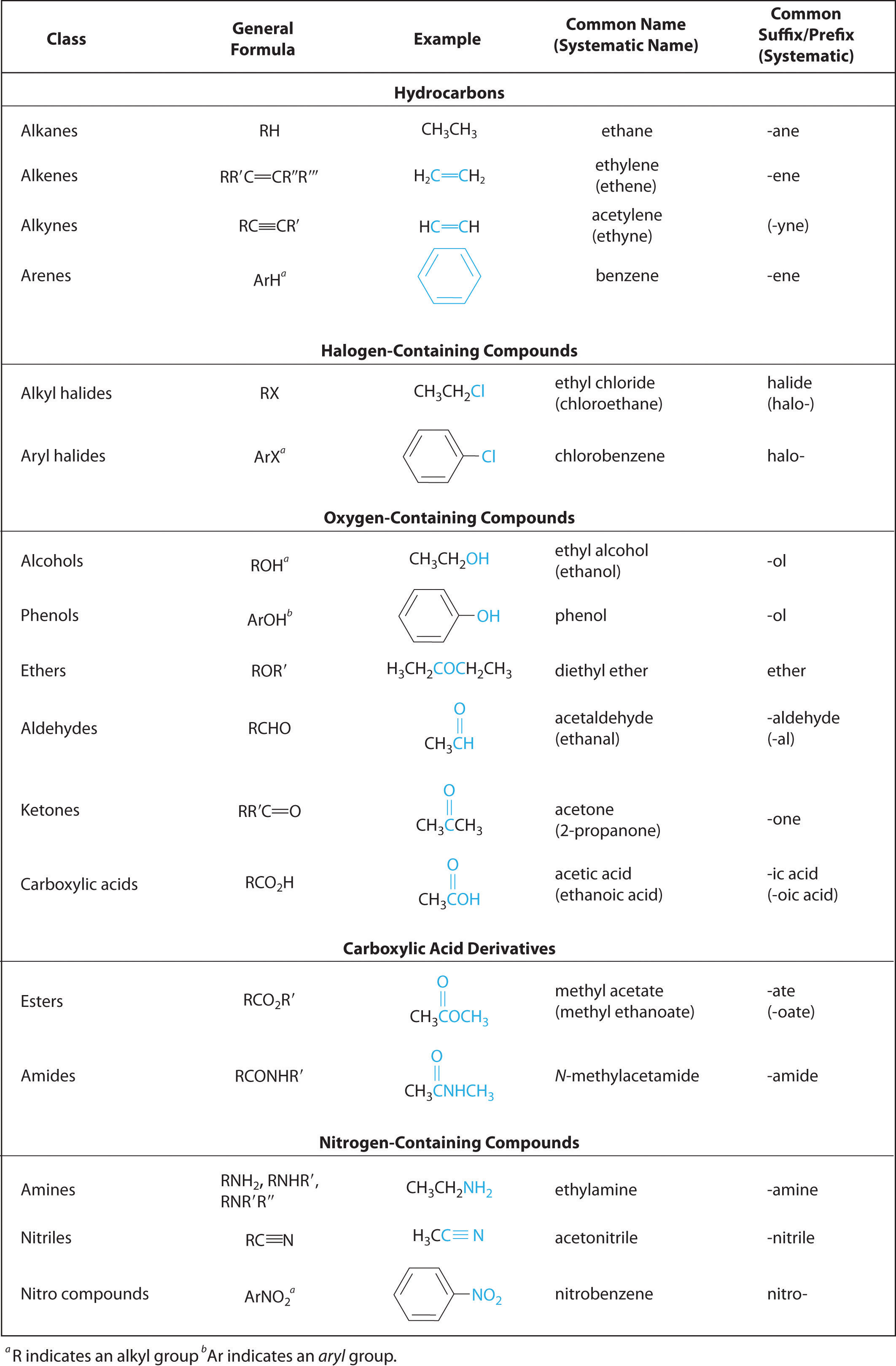 In Chapter 2 "Molecules, Ions, and Chemical Formulas" and Chapter 5 "Energy Changes in Chemical Reactions", you were introduced to several structural units that chemists use to classify organic compounds and predict their reactivities. These functional groupsThe structural units that chemists use to classify organic compounds and predict their reactivities under a given set of conditions., which determine the chemical reactivity of a molecule under a given set of conditions, can consist of a single atom (such as Cl) or a group of atoms (such as CO2H). The major families of organic compounds are characterized by their functional groups. Figure 24.1 "Major Classes of Organic Compounds" summarizes five families introduced in earlier chapters, gives examples of compounds that contain each functional group, and lists the suffix or prefix used in the systematic nomenclature of compounds that contain each functional group.