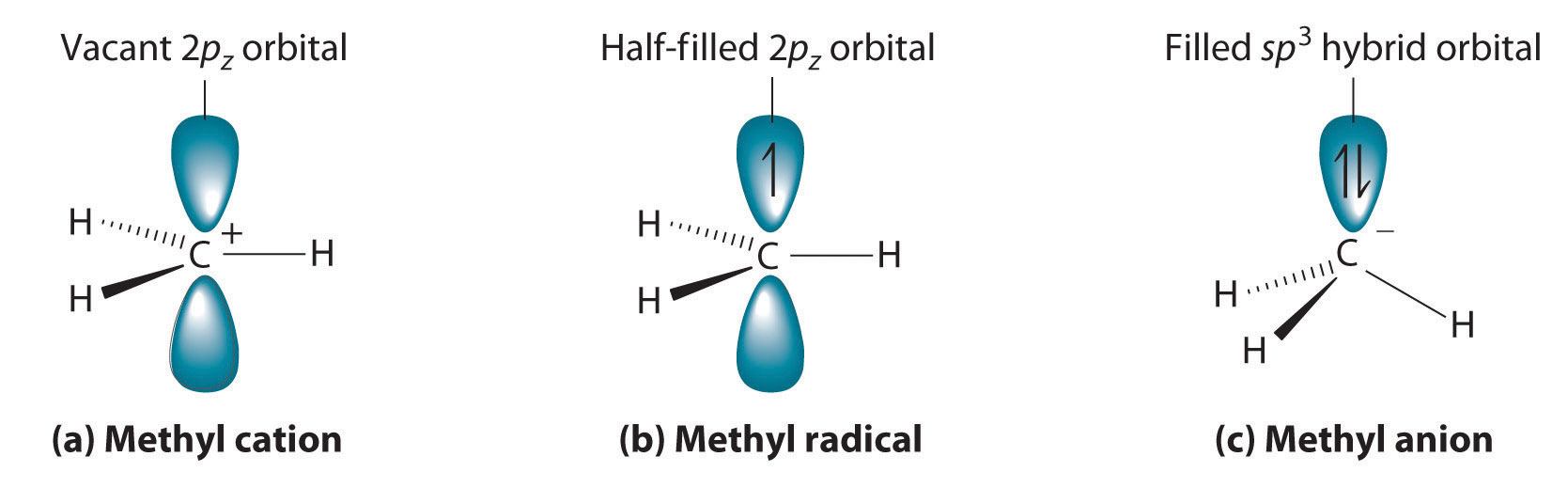 (a) The simplest carbocation is the methyl cation (CH3+), which has six valence electrons and is an electrophile. Its structure is trigonal planar, with an sp2 hybridized carbon and a vacant p orbital. (b) The methyl radical (·CH3) is a radical that, like the carbocation, is trigonal planar and an electrophile. It is also sp2 hybridized, but there is a single electron in the unhybridized p orbital. (c) The simplest organic carbanion is CH3−, which has a trigonal pyramidal structure with an sp3 hybridized carbon that has a lone pair of electrons. Because it has a strong tendency to share its lone pair with another atom or molecule, a carbanion is a nucleophile.