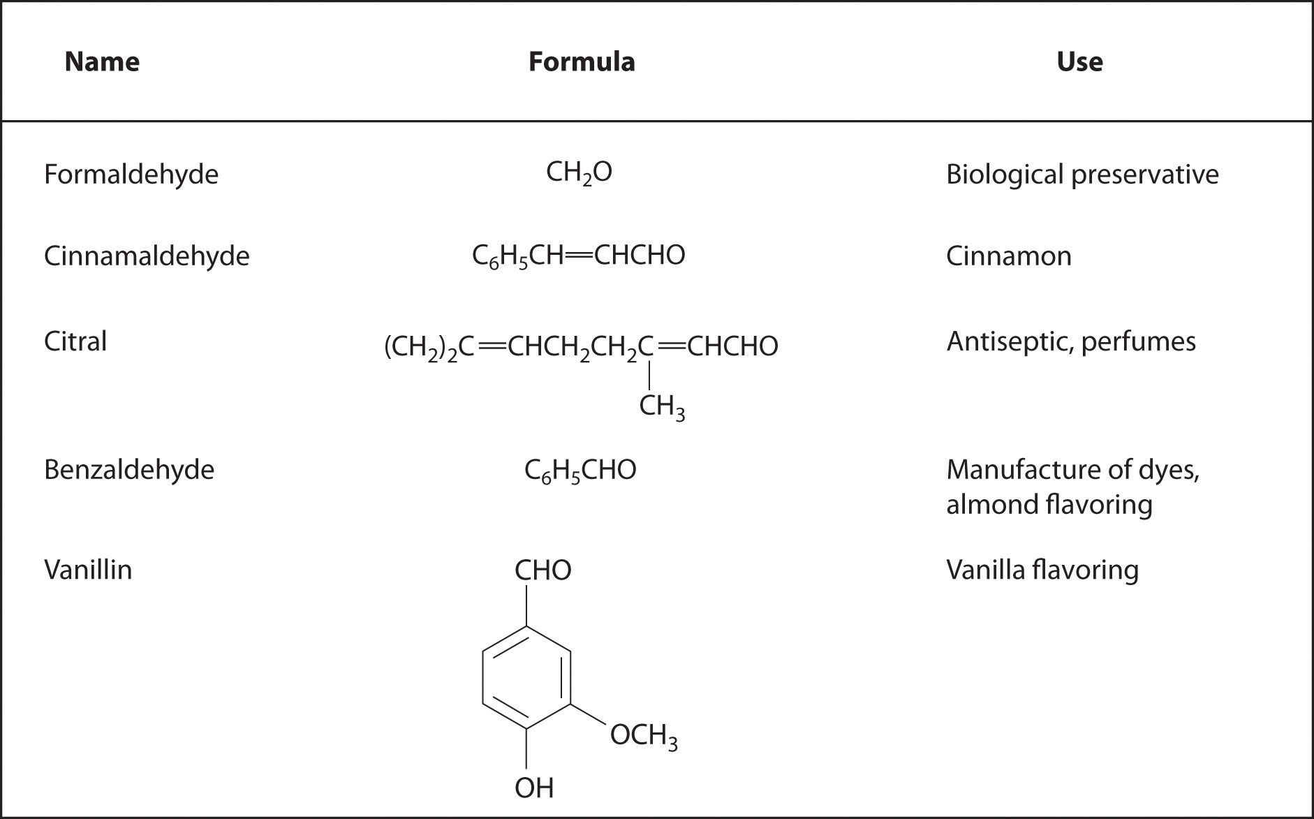 Aromatic aldehydes, which have intense and characteristic flavors and aromas, are the major components of such well-known flavorings as vanilla and cinnamon (Figure 24.17 "Some Familiar Aldehydes and Their Uses"). Many ketones, such as camphor and jasmine, also have intense aromas. Ketones are found in many of the hormones responsible for sex differentiation in humans, such as progesterone and testosterone. (For more information on aldehydes and ketones, see Chapter 4 "Reactions in Aqueous Solution", Section 4.1 "Aqueous Solutions".)