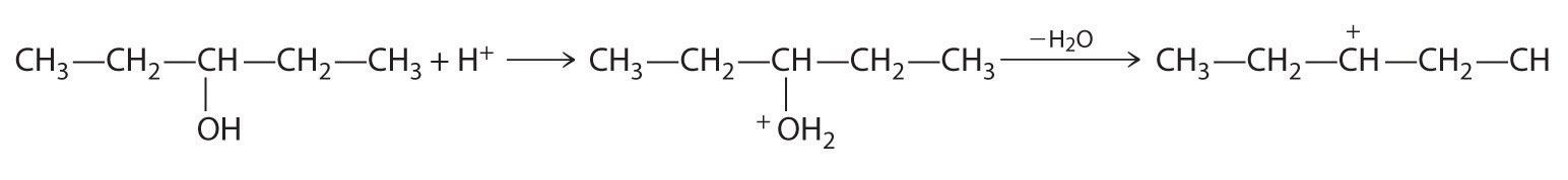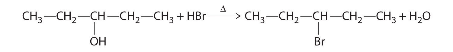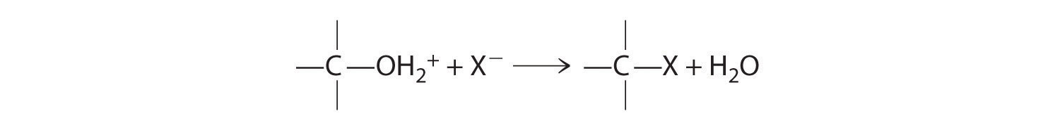 Cleavage of the C–O bond in alcohols occurs under acidic conditions. The –OH is first protonated, and nucleophilic substitution follows: